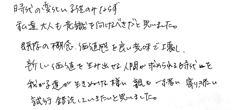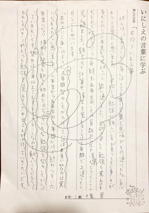 また、日地谷先生にはいつも明るく前向きな言葉で励まして頂いたことが、大きな自信になったと思います。中学生になっても、マイペースに楽しく学研教室で学んでほしいと思います。
