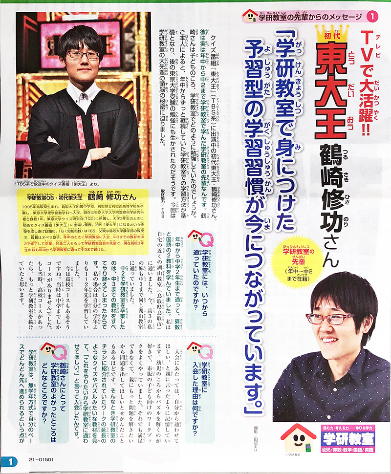 年中から中学生までの継続した学研教室での学習したおかげで東大に合格したそうです。