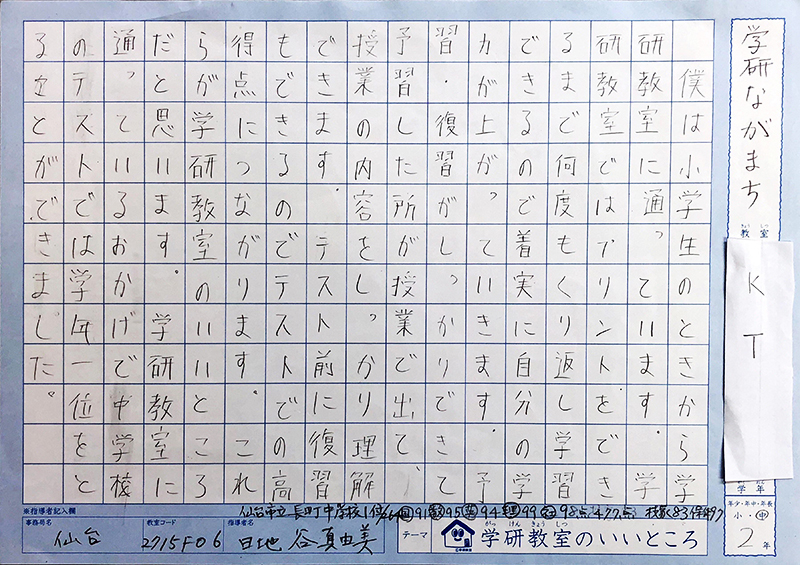 私が、仙台二華中学校に合格できたのは、学研教室のたくさんの教材と、私に学習のアドバイスをしてくれたり、励ましてくれた日地谷先生のおかげだと思います。