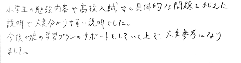公立中高一貫校向けの対策問題集や学研の教材など、娘に合ったものをその都度渡して頂き楽しみながら取り組むことができました。