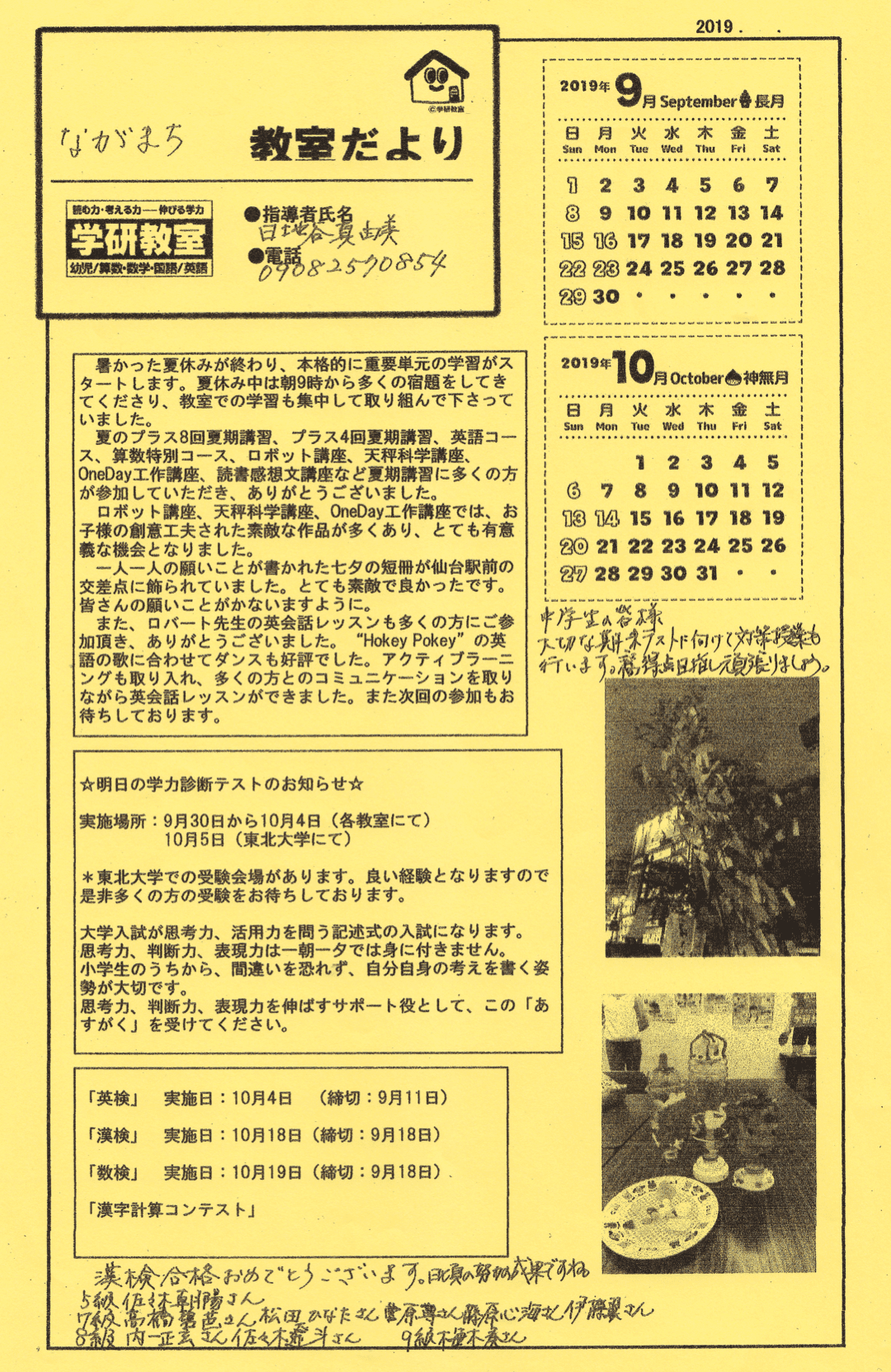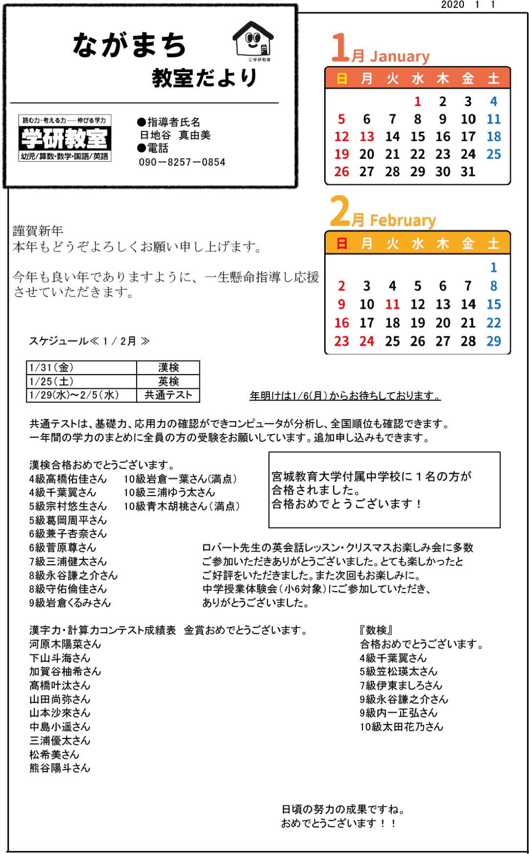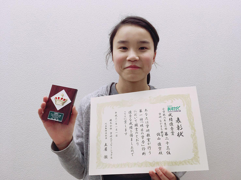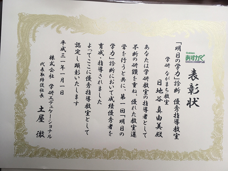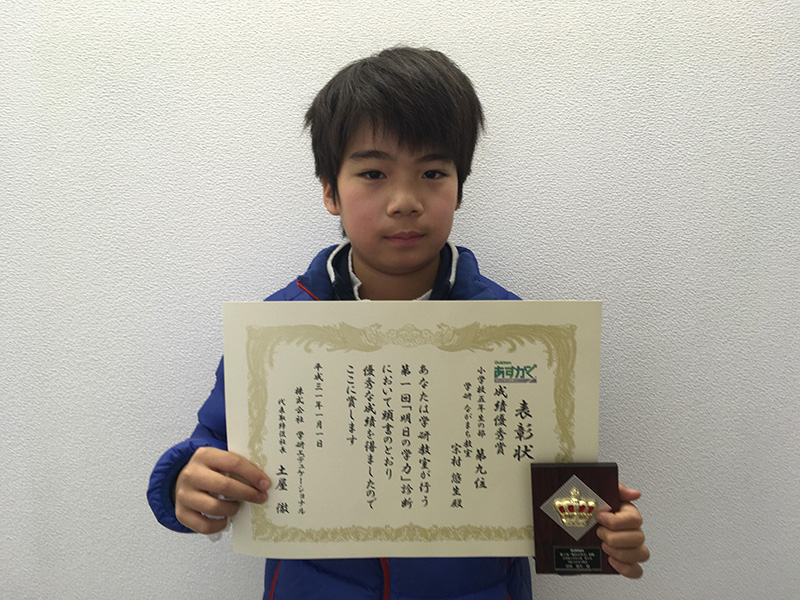 また明日の学力テストで5年生M Yさんは9位(3896名中)で表彰を受けました。素晴らしい成績です。 お二人ともながまち教室で低学年から通塾して学研教材で算国英語理社読書作文コースで中学1年教材まで解ききっています。明日の学力テストはこれからの教育改革で身に付けたい求める思考力活用力表現力読解力の問題です。日々の学習の成果です。本当におめでとうございます。これからも益々楽しみです。