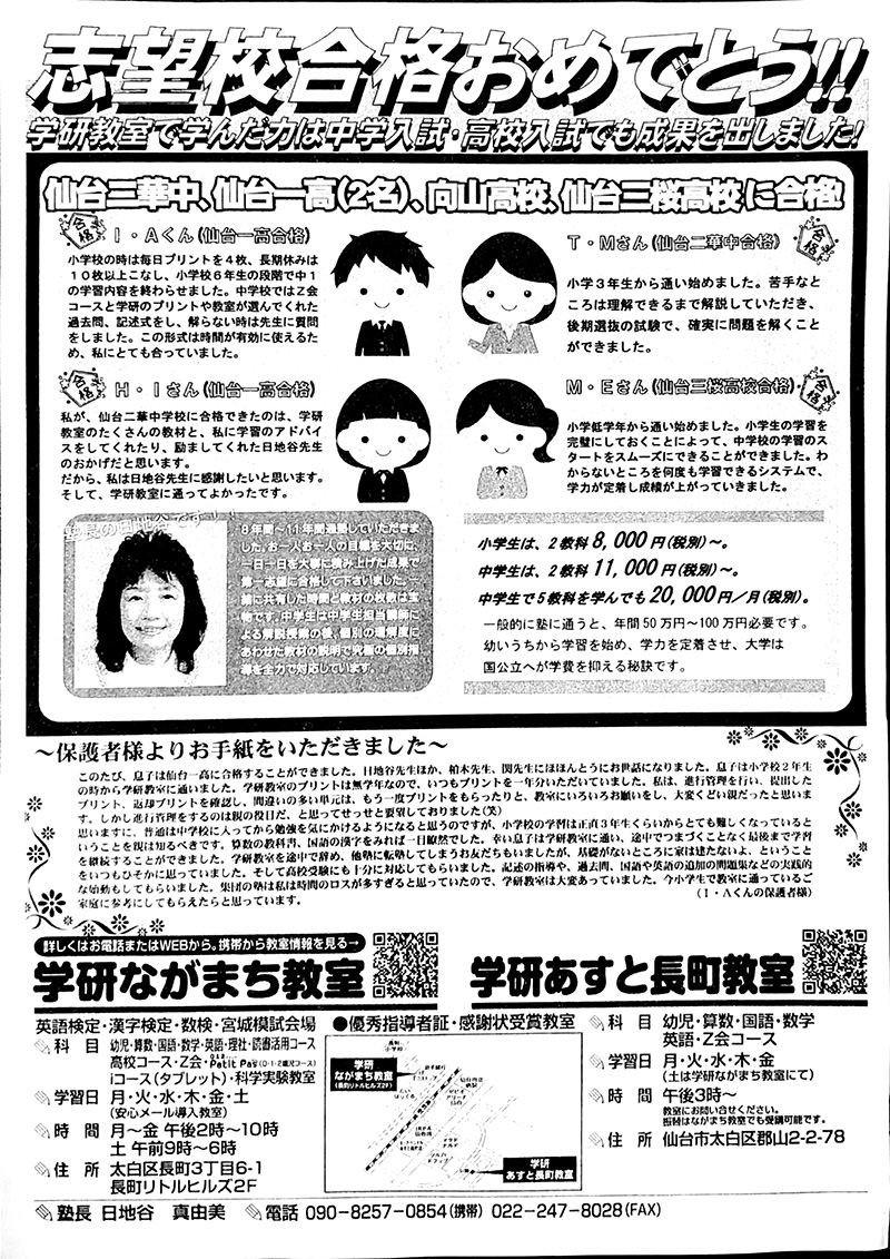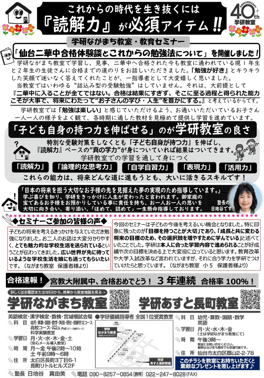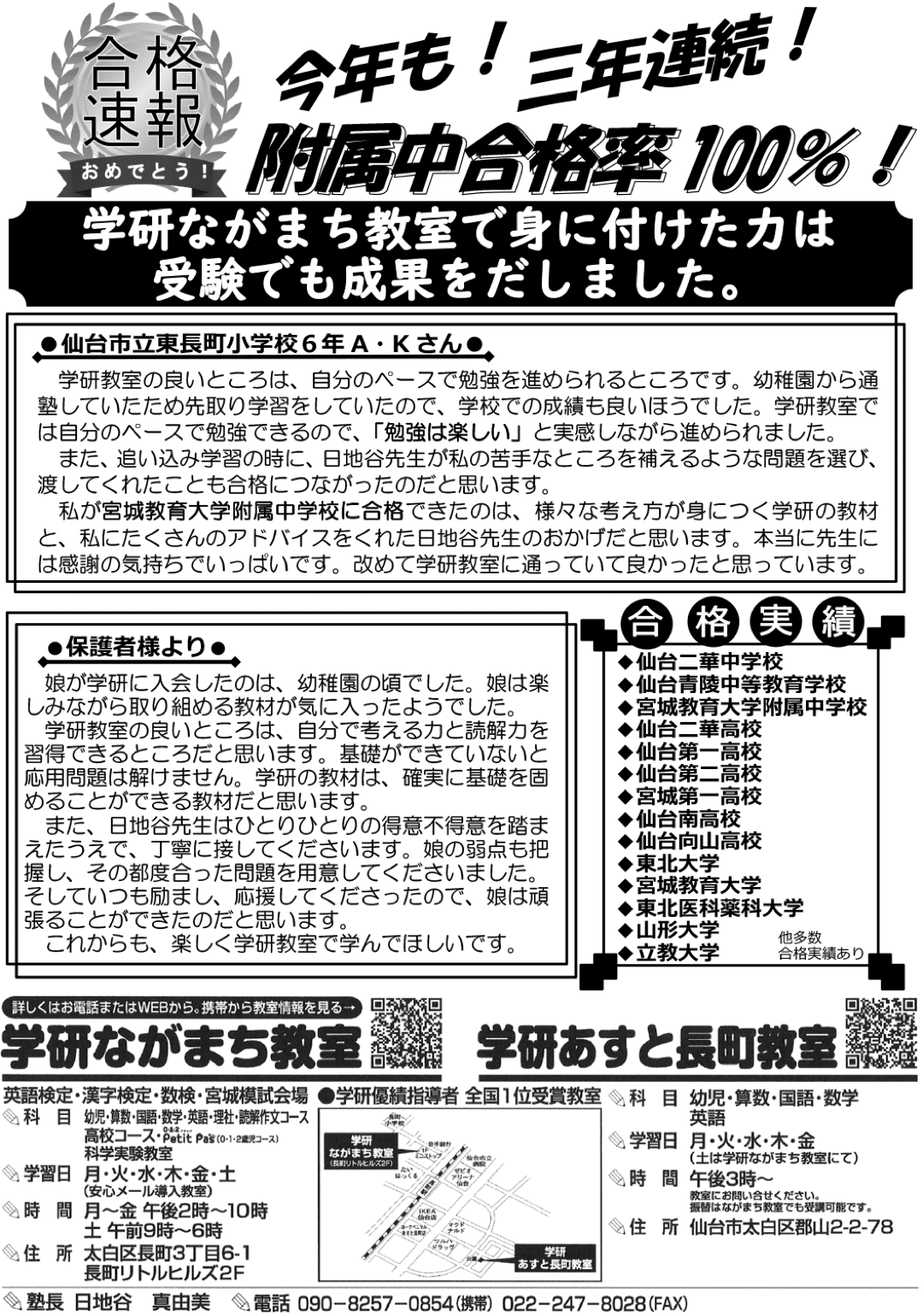 合格速報 長町小6年SYさんが仙台二華中学校に合格しました。明日の学力テストでも全国4000名受験中23位で表彰されました。低学年からながまち教室に通塾して学研教材を自分で考え積み上げた成果です。本当におめでとうございます。ながまち教室で去年に続いて二年連続での仙台二華中合格です。