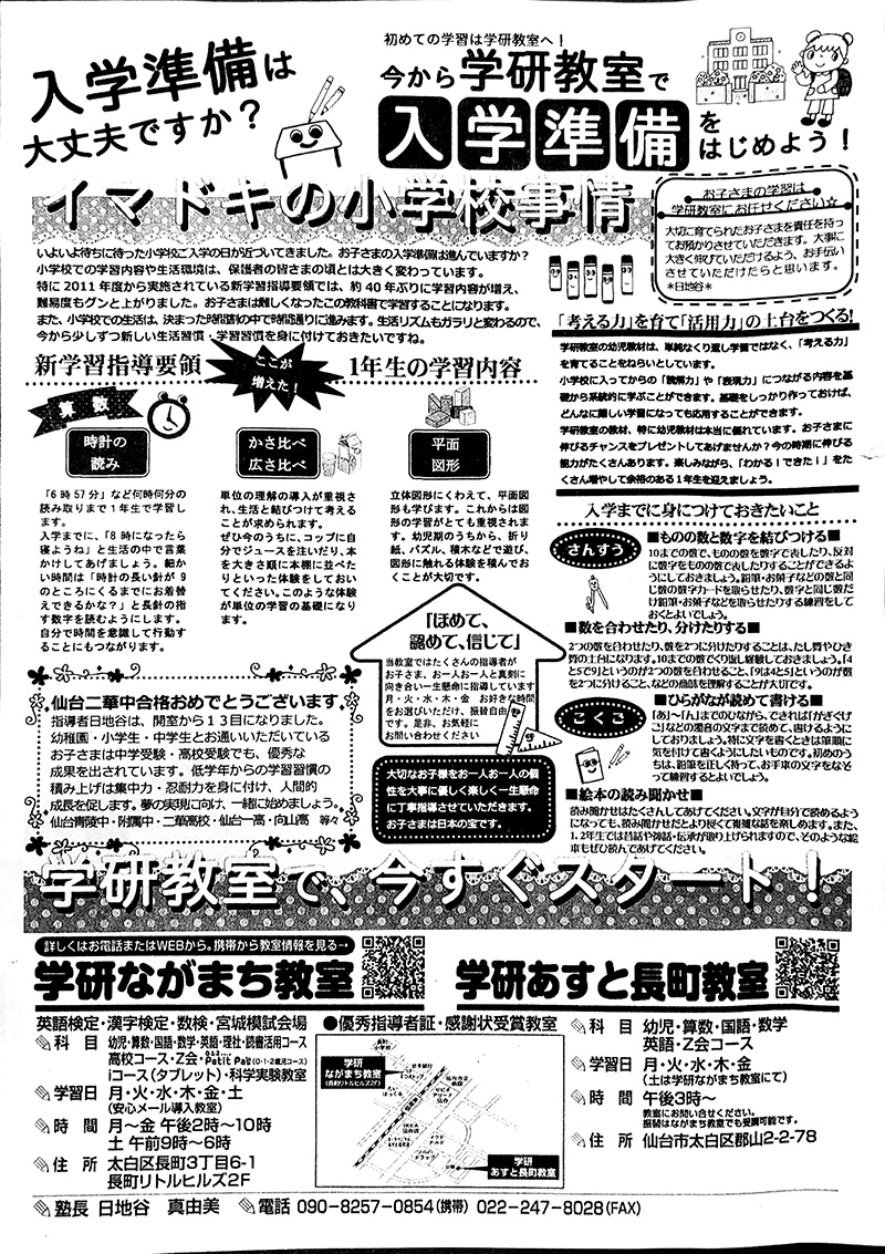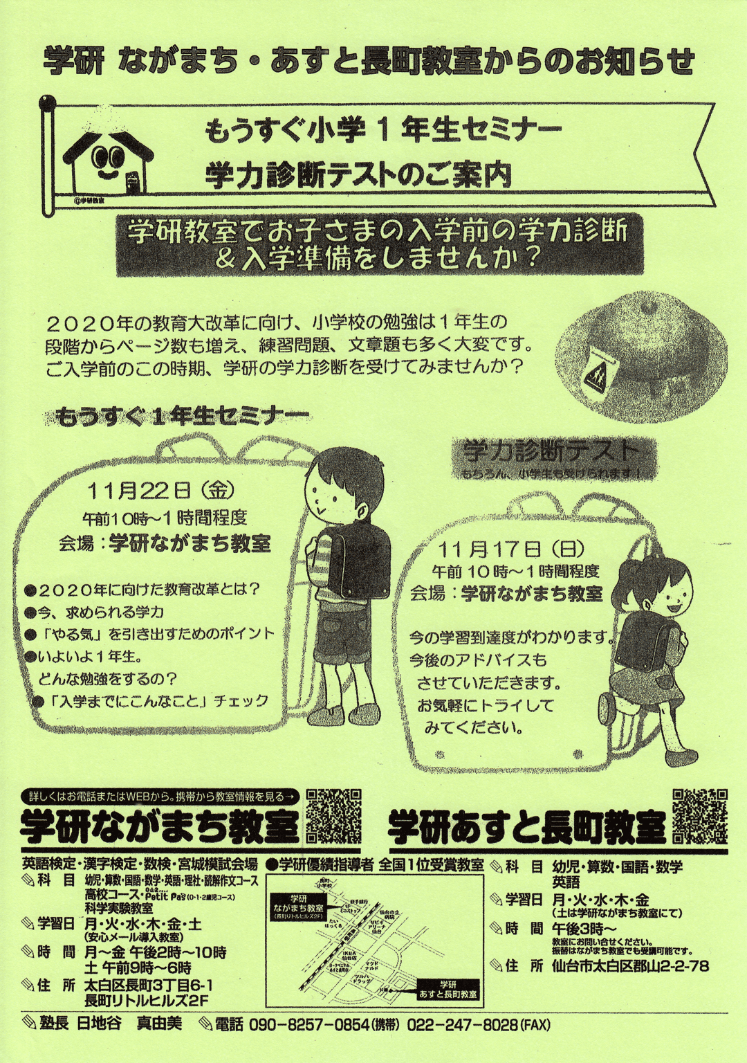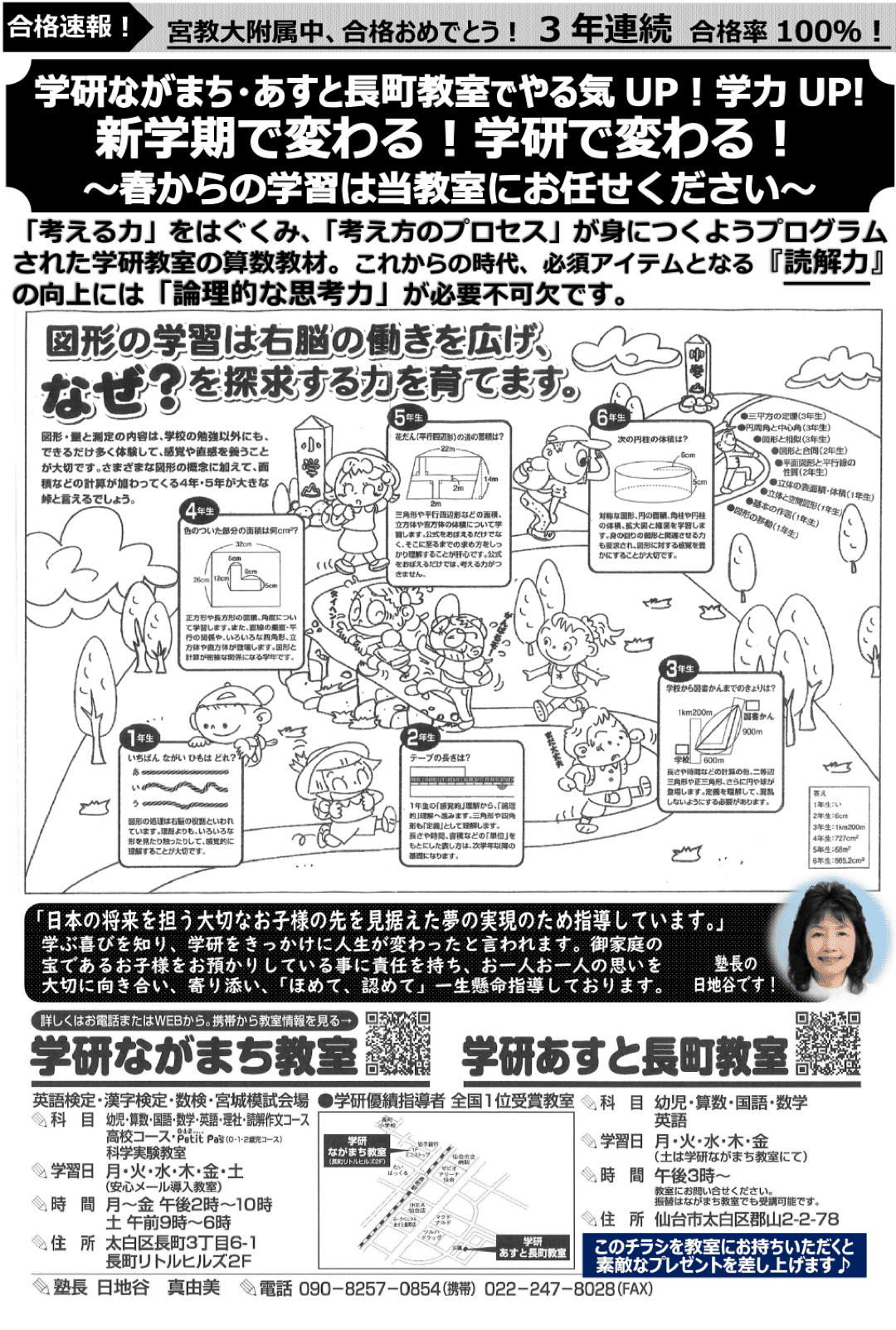 合格速報 長町小6年SYさんが仙台二華中学校に合格しました。明日の学力テストでも全国4000名受験中23位で表彰されました。低学年からながまち教室に通塾して学研教材を自分で考え積み上げた成果です。本当におめでとうございます。ながまち教室で去年に続いて二年連続での仙台二華中合格です。