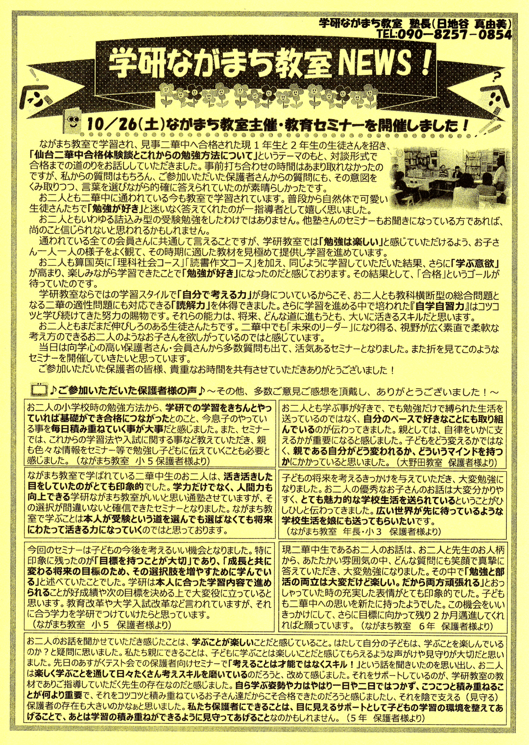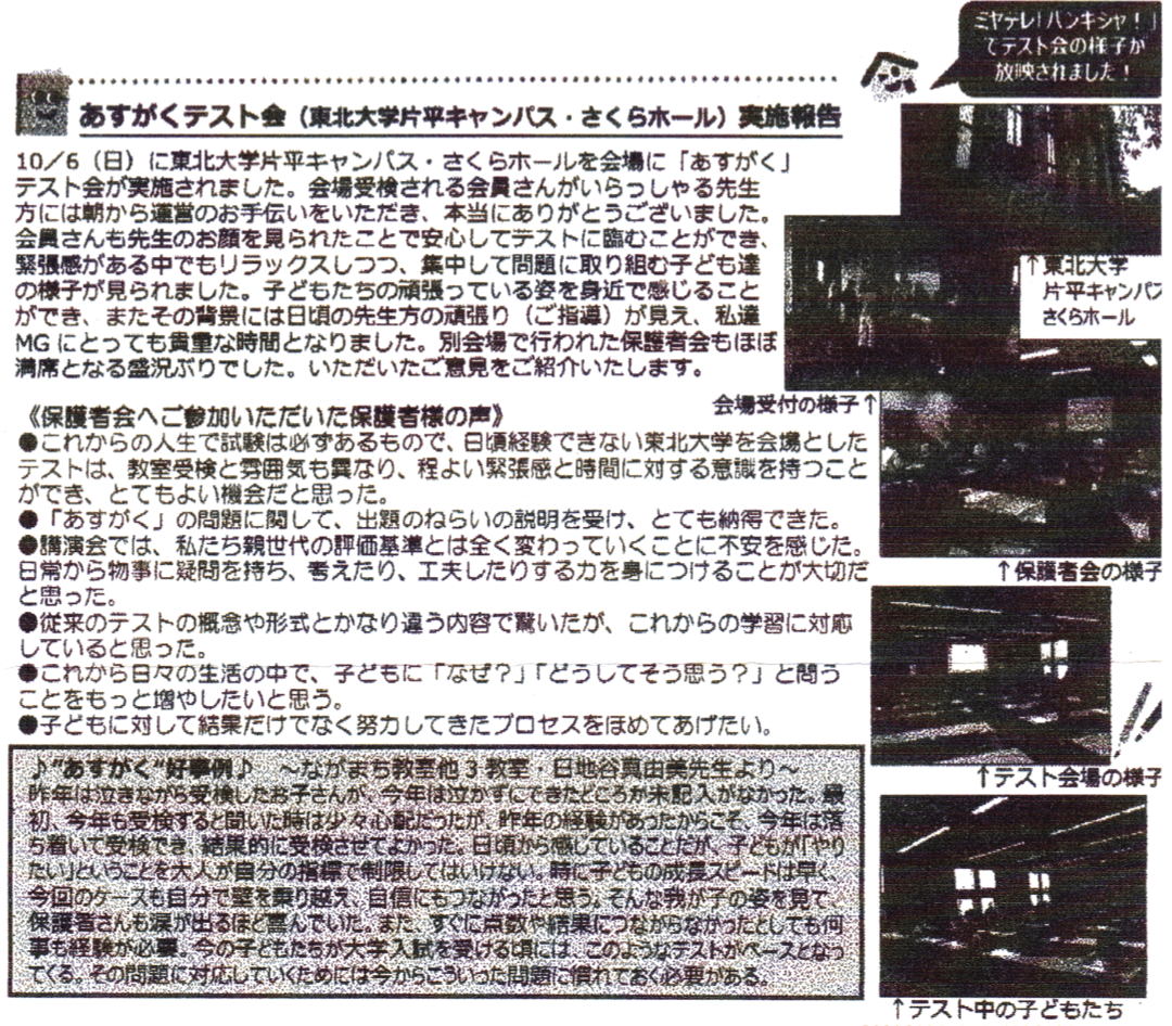 10月6月東北大学にて「明日の学力テスト」と保護者説明会講演会に多数ご参加頂き有難うございました。貴重な経験となったと生徒さん保護者の方々に好評でした。テレビ局の取材がありミヤギテレビ「バンキシャ」で放映されました。