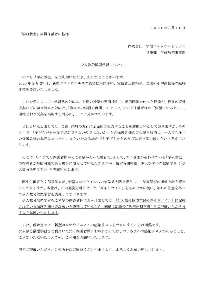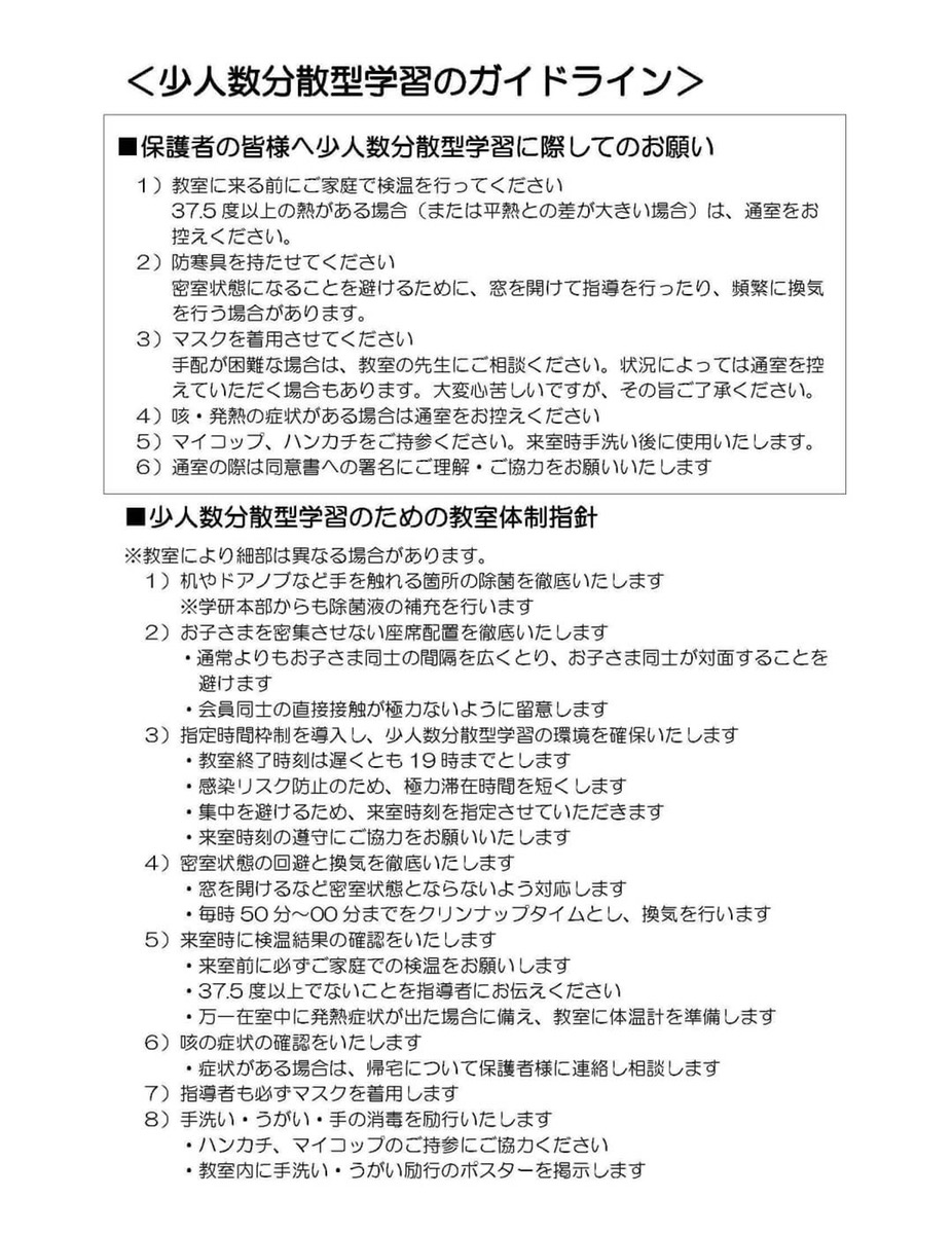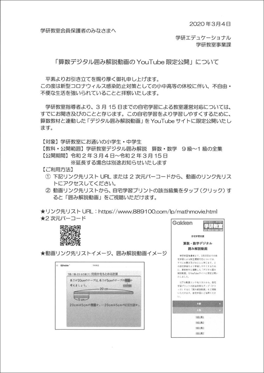 コロナウィルス感染拡大防止により学校の休校期間も長期化しています。当教室では学習面のご支援はもちろんですがお子様たちの生活習慣面のサポートもさせて頂きます。1日の生活や学習計画の提案を行うことでお子様が少しでも明るく前向きになれるようお手伝いできればと考えております。子供たちの学びを止めないために指導者全員で力を合わせ指導をさせて頂きます。教材学習の理解のための動画解説、zoom によるオンライン学習、LINEによる質問なども対応させて頂きいてます。宜しくお願い致します。