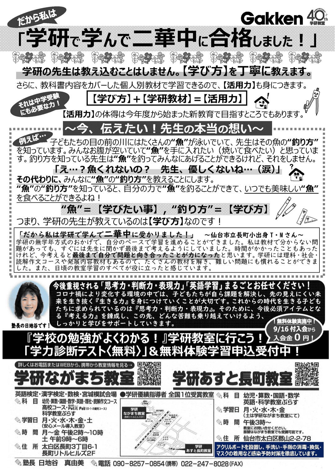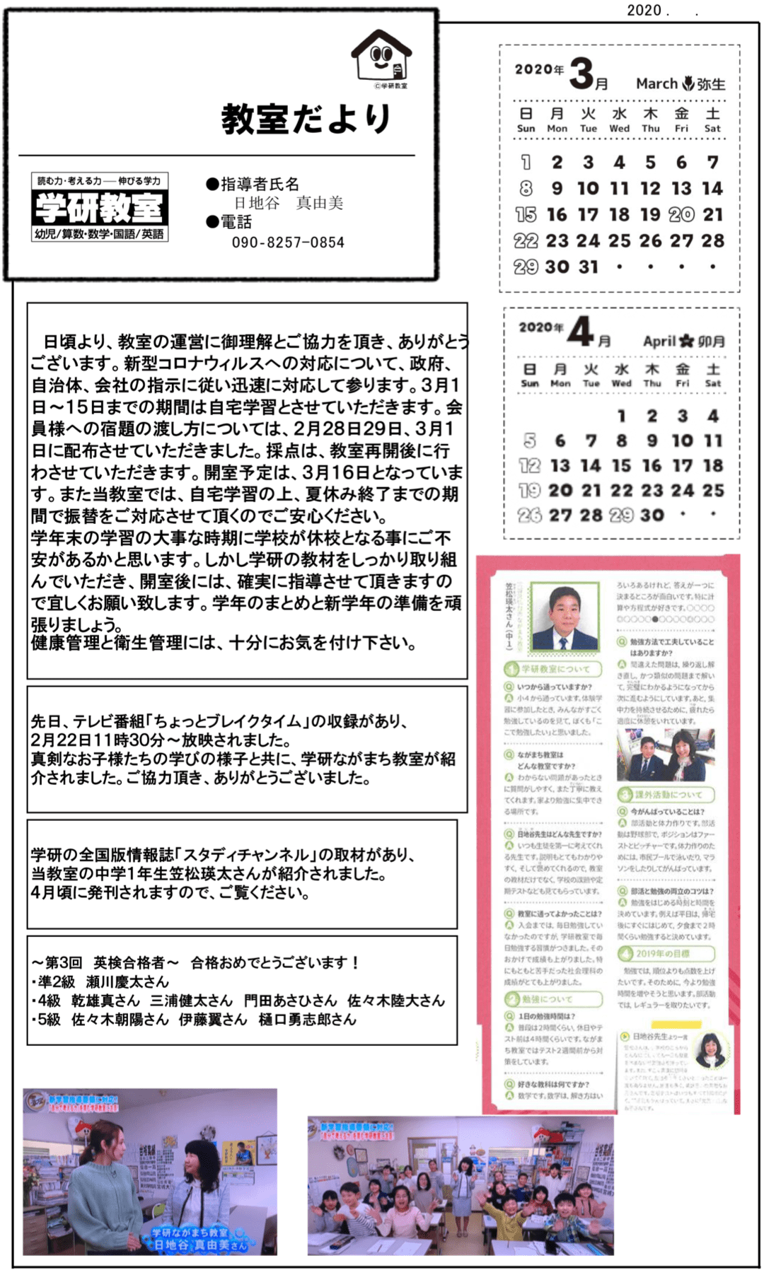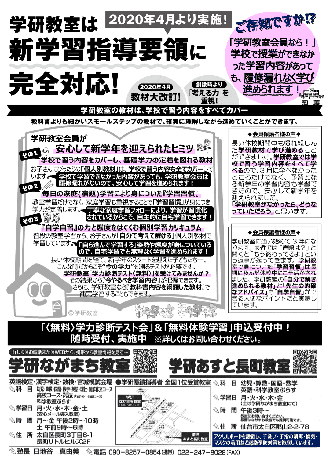 コロナウィルス感染拡大防止により学校の休校期間も長期化しています。当教室では学習面のご支援はもちろんですがお子様たちの生活習慣面のサポートもさせて頂きます。1日の生活や学習計画の提案を行うことでお子様が少しでも明るく前向きになれるようお手伝いできればと考えております。子供たちの学びを止めないために指導者全員で力を合わせ指導をさせて頂きます。教材学習の理解のための動画解説、zoom によるオンライン学習、LINEによる質問なども対応させて頂きいてます。宜しくお願い致します。