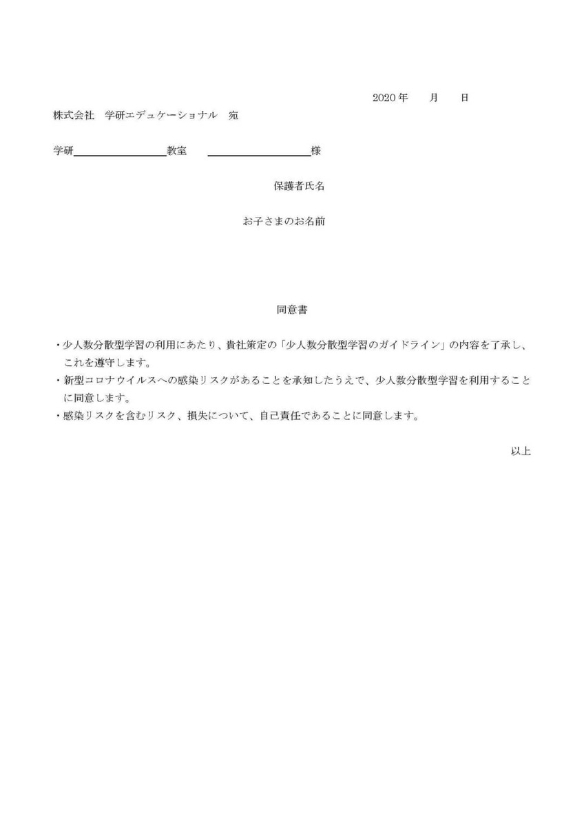 コロナウイルス対策の同意書についてです。
