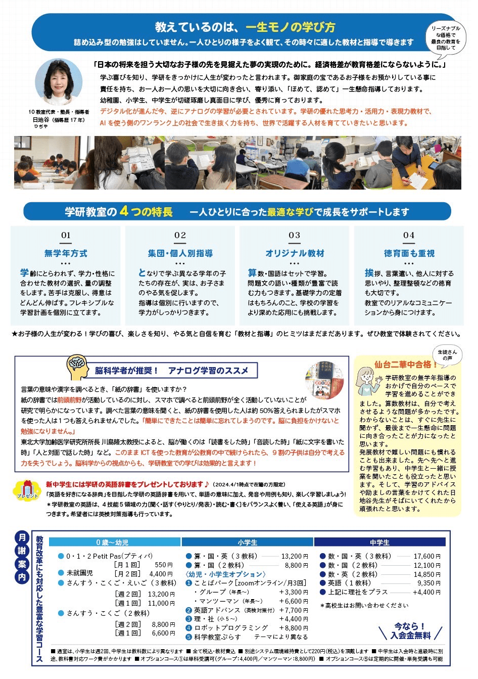 学研教室の現年長会員(2024年4月から新小1生)もしくは現小6会員(2024年4月から新中1生)で、期間中に「入学おめでとう4月予約キャンペーン申込券」をご提出された方に学研の辞書をプレゼントします。詳しくはお問い合わせください。