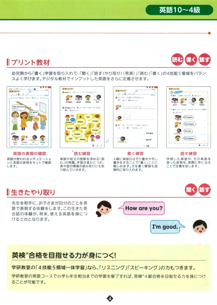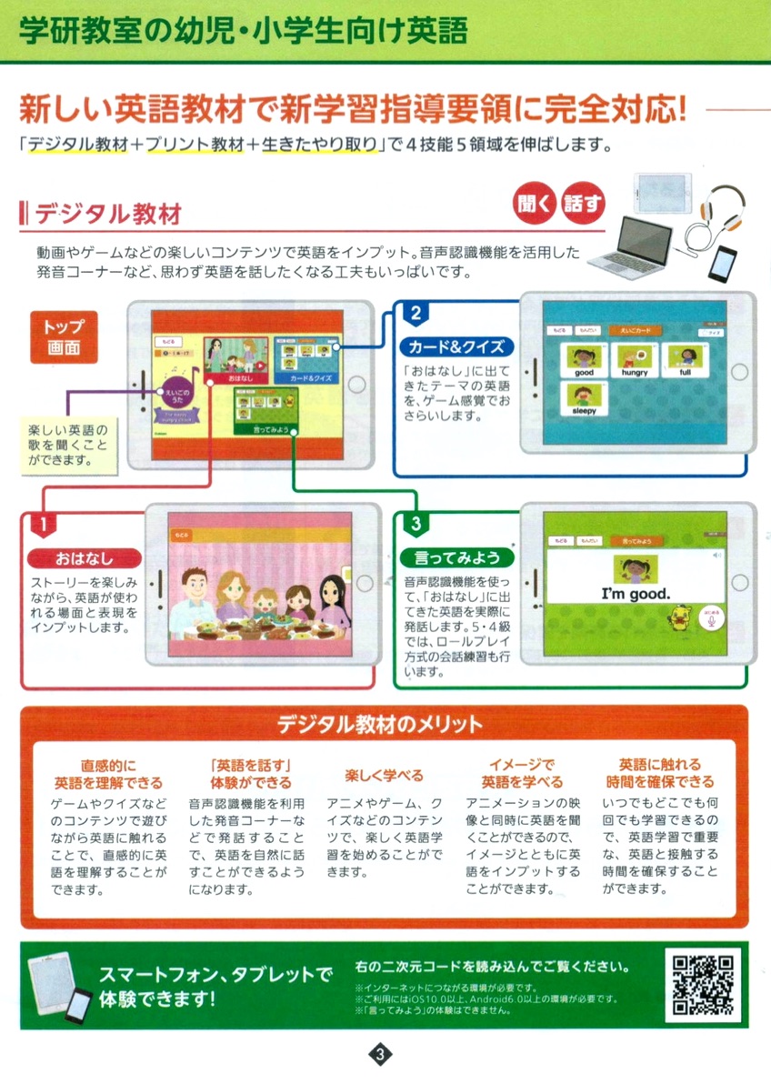 学研教室では、英語の教材にも力を入れております。カラーで楽しくわかりやすい教材とデジタル教材を活用することで興味を引き出し、お子様の【読み・書き・話す】の力を伸ばします。
